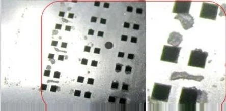PCB A过炉板与板高度过大存在5CM | 刮刀旅程外杂质大量锡膏 | ||